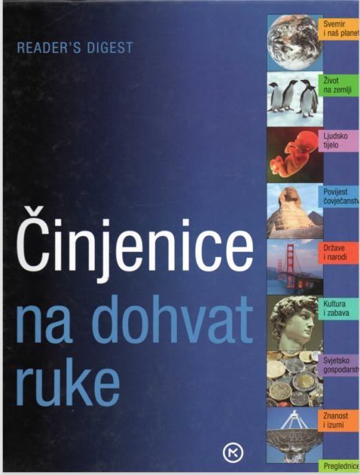 Suvremeni je svijet preplavljen informacijama. Dio tih informacija je lažan, dio pogrešan, vrlo velik dio posve neuporabljiv ili od male vrijednosti. Kako, onda, možete doznati ono što vam je potrebno? A ako brzo morate doći do neke važne činjenice, kako možete biti sigurni da je izvor dobar, a ono što u njemu nađete točno? Knjiga Činjenice na dohvat ruke pravi je odgovor na to. Riječ je o sažetku najčešće postavljanih pitanja i najkorisnijih podataka o svijetu. Riječ je o knjizi koja iz gomile informacijskog blata izvlači grumenje zlata. To je logičan prvi izvor prije no što uključite računalo ili krenete u knjižnicu - u devedeset posto slučajeva uštedjet će vam suvišan trud.Stranica: 640Dimenzije: 28,5 cmJezik: ZagrebPismo: LatinicaStanje: OdličnoUvez: TvrdiGodina: 2007