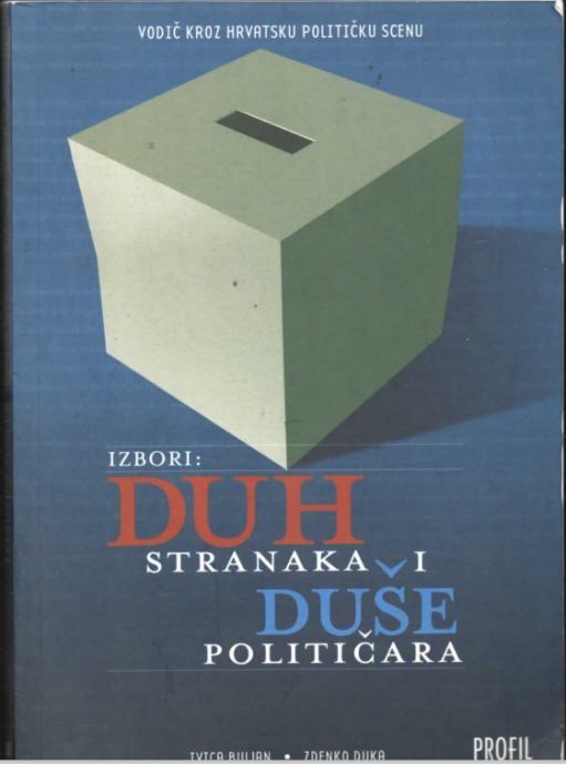 Knjiga Izbori: duh stranaka i duše političara, napisana u skladu s temeljnim načelima novinarske struke — kratko, jasno i istinito, daje pregled najjačih političkih stranaka i analizira karijere i postupke najpopularnijih političara u Hrvatskoj. Povod su, dakako, hrvatski parlamentarni izbori, ali je publicistička ambicija ove knjige trajati dulje od predizborne kampanje, pobjedničkog slavlja i vremena konstituiranja nove vlasti u Hrvatskoj. jer, 12 prikazanih i analiziranih stranaka ostat će na političkoj pozornici i nakon izbora, a Mali leksikon 136 političarki i političara omogućit će vam političko snalaženje u njihovim budućim političkim sukobima. Autori su ovaj vodič kroz hrvatsku političku scenu napravili objektivno i uravnoteženo, ali se pod krinkom „neutralnosti nisu odrekli svog stava i novinarske slobode, nego su nastojali zaći malo pod kožu ili kako naslov knjige kaže — u „duh stranaka i u „duše političara.Stranica: 201Dimenzije: 14X20Jezik: ZAGREBPismo: LatinicaStanje: Nova knjigaUvez: MekiGodina: 2003
