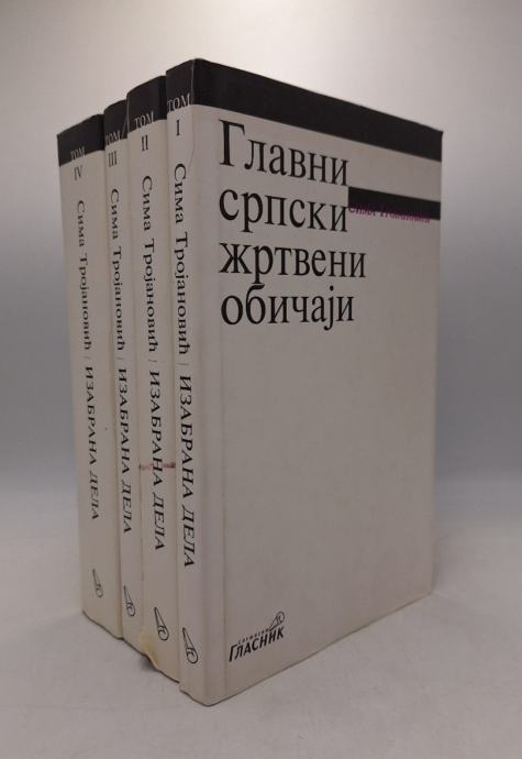 Sima Trojanović: Izabrana dela I-IVI knjiga: GLAVNI SRPSKI ŽRTVENI OBIČAJI - 207 str.II knjiga: VATRA U OBIČAJIMA I ŽIVOTU SRPSKOG NARODA - 368 str.III knjiga: PSIHOFIZIČKO IZRAŽAVANJE SRPSKOG NARODA POGLAVITO BEZ REČI - 254 str.IV knjiga: JEDINSTVO NARODNOG DUHA - 694 str.Stranica: 207+368+254+694Dimenzije: 15x24.5Jezik: BeogradPismo: ĆirilicaStanje: OdličnoUvez: Tvrdi s ovitkomGodina: 2008