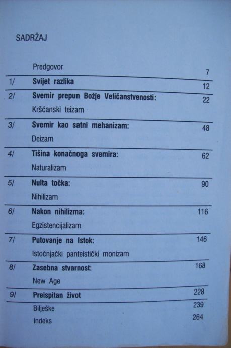 Na jasan i lako razumljiv način W. Sire je objasnio osnove teizma, deizma, naturalizma, nihilizima, egzistencijalizma, istočnjačkog monizma i New Agea. Knjiga govori o borbi za otkrivanje vlastite vjere, vlastitog svjetonazora, vlastitih uvjerenja.