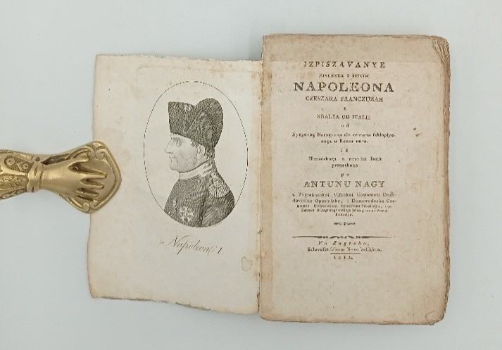 Robert Plersch: Izpiszavanye xivlenya i csinih Napoleona Czeszara Franczuzah i Kralya od ItaliePrijevod Antun Nagy.Vrlo rijetko, prva objavljena knjiga o Napoleonu Bonaparteu na hrvatskom jeziku.Tabla s portretom Napoleona.Knjiga je tiskana u vrijeme Ilirskih provincija, tj. perioda u kojem je Napoleon vladao dijelom hrvatskih zemalja.Antun Nagy (Požega , 14. siječnja 1774. - Vojvodina, 1847.), hrvatski književnik.Pravo je završio u Pešti. Radio je kao profesor gramatike i povijesti u Zagrebačkoj akademiji, a od 1809. godine djeluje kao cenzor i revizor knjiga u Budimu.[1] Pisao je književna djela i pjesme, prevodio, izdavao kalendare, a 1818. čak i pokušao tiskati novine. Kroz svoje djelovanje, zauzimao se za jedinstveni književni jezik te na neki način i bio preteča ilirskog pokreta. Djela je prevodio mješavinom kajkavskog i štokavsko-ikavskog govora.Najpoznatije mu je djelo "Ispisivanje življenja i čini Napoleona..." (Izpiszavanye xivlenya i csinih Napoleona czeszara Franczuzah i kralya od Italie : od nyegovog narodgyena do vrimena szkloplyenoga mira u Tilsitu / iz nimachkogo u narodni jezik prenesheno po Antunu Nagy) koje je tiskano u Zagrebu 1810. Stranica: 407 20Dimenzije: 13x21Jezik: ZagrebPismo: LatinicaStanje: Vrlo dobroUvez: MekiGodina: 1811