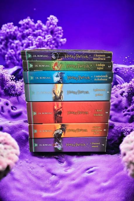 Komplet sadrži:1. kamen mudraca2. odaja tajni3. zazočenik Azkabana4. plameni pehar5. Red feniksa6. Princ miješane krvi7. Darovi smrtiHarry Potter je serijal od sedam romana koje je napisala britanska književnica J. K. Rowling. Knjige opisuju avanture mladog čarobnjaka Harryja Pottera i njegovih najboljih prijatelja Rona Weasleyja i Hermione Granger, učenika Škole vještičarenja i čarobnjaštva Hogwarts. Okosnica radnje romana je Harryjev sukob sa zlim čarobnjakom Lordom Voldemortom, čiji je cilj osvojiti čarobnjački svijet, pokoriti bezjake (ne-magične ljude) te uništiti sve one koji mu stoje na putu.Od izlaska prvog romana, Harry Potter i Kamen mudraca, 30. lipnja 1997. godine, knjige su stekle veliku popularnost, pohvalne kritike i komercijalni uspjeh. Serijal je doživio i kritike zbog sve naglašenijih mračnih tonova u priči. Prema stanju iz studenog 2020. prodano je više od 500 milijuna primjeraka romana, što je više za 150 milijuna od sljedećeg najuspješnijeg serijala po redu. Romani Harry Potter prevedeni su na više od 80 jezika. Usto, sa svakom od četiri posljednje knjige u serijalu srušen je rekord najbrže prodavane knjige u povijesti. Osim sedam romana, autor je objavio tri pseudobiblije kao dodatak sagi: Čudesne zvijeri i gdje ih naći, Metloboj kroz stoljeća i Bajke Barda Beedlea. Tome se nadovezuje scenarij predstave iz 2016. godine, Harry Potter i ukleto dijete. 2012. godine pokrenut je i web portal Pottermore, posvećen širenju novih uvida u čarobnjački svijet.Knjige na engleskom u Ujedinjenom se Kraljevstvu objavljuju u nakladi Bloomsbury Publishinga, u SAD-u u nakladi Scholastic Pressa, u Australiji u izdanju Allen & Unwina, a u Kanadi u izdanju Raincoast Booksa. U Hrvatskoj knjige je izdavao Algoritam u prijevodu Zlatka Crnkovića (1. – 3. knjiga) i Dubravke Petrović (4. – 7. knjiga). Do 2010. godine, šest je knjiga doživjelo i svoja filmska izdanja koja je producirao Warner Bros.; to je najprofitabilniji filmski serijal svih vremena. Sedma je knjiga podijeljena na dva filma: Harry Potter i Darovi smrti 1. dio koji je premijerno prikazan 19. studenog 2010. i Harry Potter i Darovi smrti 2. dio koji je premijerno prikazan 15. srpnja 2011. Serijal je popraćen i velikom količinom proizvoda za obožavatelje što brand Harry Potter čini vrijednim više od 15 milijardi dolara.Stranica: 3317Dimenzije: 13x19.5Jezik: ZagrebPismo: LatinicaStanje: OdličnoUvez: MekiGodina: 2014