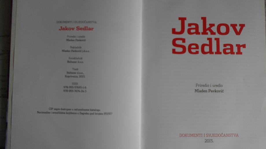 JAKOV SEDLAR dokumenti i svjedočanstva,autor Mladen Pavković,2013.g.