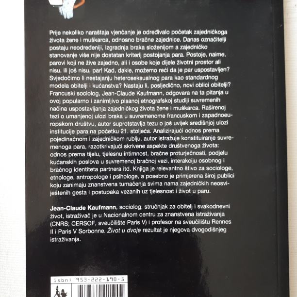Prije nekoliko naraštaja vjenčanje je određivalo početak zajedničkoga života žene i muškarca, odnosno bračne zajednice. Danas označitelji postaju neodređeniji, izgradnja braka složenijom a zajedničko stanovanje više nije dostatan kriterij postojanja para. Postoje, naime, parovi koji ne žive zajedno, ali i osobe koje dijele životni prostor ali nisu, ili još nisu, par! Kad, dakle, možemo reći da je par uspostavljen? Svjedočimo li nestajanju heteroseksualnog para kao standardnog modela obitelji i kućanstva? Nastaju li, posljedično, novi oblici obitelji? Francuski sociolog, Jean-Claude Kaufmann, odgovara na ta pitanja u ovoj popularno i zanimljivo pisanoj etnografskoj studiji suvremenih načina uspostavljanja zajedničkog života žene i muškarca. Raširenoj tezi o umanjenoj ulozi braka u suvremenome francuskom i zapadnoeuropskom društvu, autor suprotstavlja tezu o još uvijek središnjoj ulozi institucije para na početku 21. stoljeća. Analizirajući odnos prema pojedinačnom i zajedničkom rublju, autor istražuje konstituiranje suvremenoga para, razotkrivajući skrivene aspekte društvenoga života: odnos prema tijelu, tjelesnu intimnost, bračne proturječnosti, podjelu kućanskih poslova u suvremenoj bračnoj vezi, interakciju osobnog i bračnog identiteta partnera itd. Knjiga je relevantno štivo za sociologe, etnologe, antropologe i psihologe, a posebno je primjerena široj publici koju zanimaju znanstvena tumačenja svima nama zajedničkih neosviještenih gesta i postupaka vezanih uz tjelesnost i život u paru. Jean-Claude Kaufmann, sociolog, stručnjak za obitelj i svakodnevni život, istraživač je u Nacionalnom centru za znanstvena istraživanja (CNRS; CERSOF, sveučilište Paris V) i profesor na sveučilištu Rennes II i Paris V Sorbonne. Život u dvoje rezultat je njegova dvogodišnjeg istraživanja