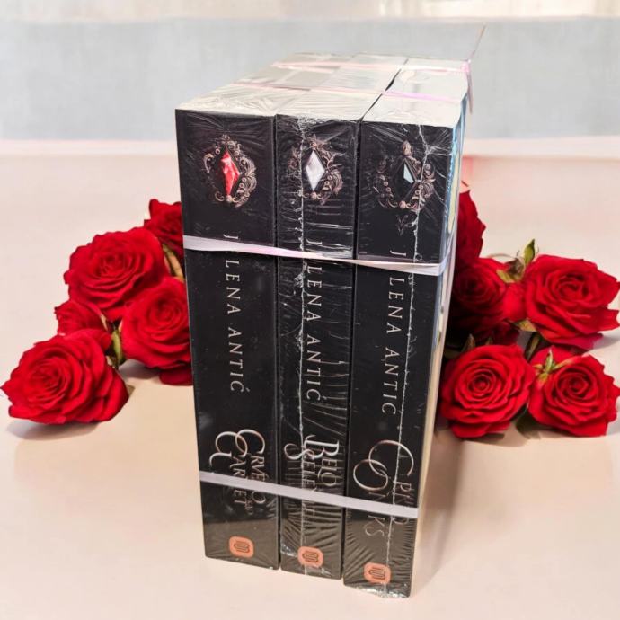 Crveno kao garnet“Ovo nije naš kraj… obećavam”Adora se vraća u Garneton gde će otići na sam kraj sveta kako bi spasila Dantea. Na tom putovanju zapašće u toliko duboku tamu koja će na nju ostaviti večni trag. Sindorije više ne napadaju Adoru, već je dozivaju. Da li je Adora zapala u tamu toliko duboku, da je sada stvorenja tame smatraju saveznikom?Sam lord tame je doziva. Kraj se bliži. Zlo se budi. Da li je ljubav zaista najmoćnija magija na svetu? Ukoliko Adori ne bude bilo povratka, hoće li njeni prijatelji biti dovoljno odani da pređu na stranu tame, ili će se okrenuti protiv nje? Bitka za Zedelmor je neizbežna. Istorija se ponavlja. Rase se moraju udružiti da bi pokorile lorda tame i njegove sledbenike. Ali ovoga puta, to neće biti dovoljno.Hoće li ljubav spasiti svet, ili će ga uništiti?Zaplovite u poslednji deo trilogije Oniks, gde vas čeka jedno strastveno i emotivno putovanje kroz mračne predele svesti.“Verujem da ni sama autorka s početka pisanja trilogije nije znala da će ona dobiti revolucionarni karakter u svetu pisane reči. Oslikati u svakom smislu jedan nestvarni svet – likove, predele, bezvremene a svevremene, sva dešavanja spada u svojevrsno umeće. Stoga, ne bojte se obimnosti, zgrabite knjige i zakoračite u svoje biće, čekaju vas čudesa.” – BILJANA STANOJEVIĆ (pesnikinja i spisateljica)Belo kao selenit Njeni snovi je dozivaju,i šalju na avanturu života…Svet će želeti da joj oduzme moć…On će se boriti sa celim svetom za nju!Avantura se nastavlja! Adora kreće na neverovatnu pustolovinu sa družinom, kojoj se pridružuje izvesni Leonardo Mosno, princ Lenkopije. Kako je moguće da Adora oseća blisku povezanost sa njim i zašto je njegova uloga bitna? Bez svojih moći Adora postaje mamac za demone. Da li demone privlači ono što joj je oduzeto ili ono što je u njoj ostalo? Upoznajte Lenkopiju, Zeront i spektakularni Grad svetlosti! Ispratite družinu na ovom neverovatnom putovanju na kojem će biti stavljeni u najnezgodnije, najlepše i najopasnije trenutke života!„Zatekla me nespremnu. Od prvih reči u romanu pa sve do kraja. Za Jelenu nema prepreke: njena mašta je beskrajna, talenat nesporan, istrajnost dosledna. Usudila se da nas uvede u svoj izmaštani svet i rukom čarobnjaka dovela do konačnog ishoda. Njen stil pripovedanja je originalan i sada već prepoznatljiv. Način izražavanja je sažet, poput arhitekte koji gradi impozantnu građevinu. Čitaoc ima jasnu sliku svega i može da zaluta jedino u taj nepoznati svet iz kog se teška srca izlazi.“ – BILJANA STANOJEVIĆ (pesnikinja i spisateljica)Crno kao oniksAdora Garnet, potomak najmoćnijeg demonskog klana u Garnetonu, otkriva da svet nije samo ono što poznaje. Njena sudbina vodi je izvan granica Garnetona. Adora će preuzeti strašan rizik kako bi ostvarila svoje snove. Potpuno novi svet ispunjen je prelepim i zastrašujućim stvarima. Sve je drugačije! U tom svetu demoni se ubijaju! Delovi njenih sećanja su nestali, a misteriozni Vilijam Kolhejn postaje ključna figura u njenoj sudbini. Degnum postaje mesto opsade demona. Da li je Adora razlog tih napada? Njen povratak je dugo iščekivan! Za njenom moći tragaju izvesni ljudi, neko je prati u senci. Na dan kada će se svi Adorini snovi srušiti, neko će doći po njenu moć! Zaplovite u ovaj vrtlog moći i opasnosti. Da li je Adora dovoljno jaka da se sama izbori sa zadivljujućom moći oniks kristala? Da li se snovi menjaju sa nama? Da li je ljubav jača od osvete? Ovo je samo početak!“Dođe vreme kada se među nama ukažu kreatori novih svetova. Naoružani su nesvakidašnjom maštom. Oni nose jednu od najlepših titula – titulu pisca. Jelena Antić je jedan od njih. Mlada, pasionirana, slikovita i zanesena. Uronite u njen magični svet gde ništa nije “CRNO KAO ONIKS”, nemojte da vam nisam rekao.” – MILOŠ PETKOVIĆ (pisac i scenarista)Stranica: 435+345+371Dimenzije: 145mm x 205mmJezik: BeogradPismo: LatinicaStanje: Nova knjigaUvez: MekiGodina: 2024