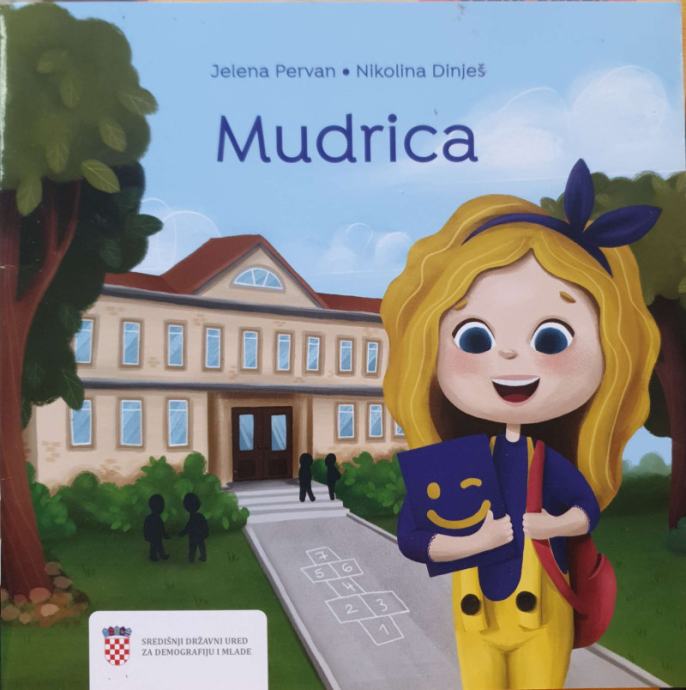 Jelena Pervan: MudricaIlustracije: Nikolina DinješUpoznaj djevojčicu Muarios koja je nedavno krenula u prvi razred. Mudrica se baš kacira svijetu voli igrati, pa se bila malo uplašila kako će njezini anni izgledati sada kada će u školi trebati sjediti mirno, biti tiho, slušati i dignuti ruku ako želi nešto reći. Bila se malo zabrinula da više neće imati vremena za igru i da bi joj mogli nedostajati njezini roditelji.