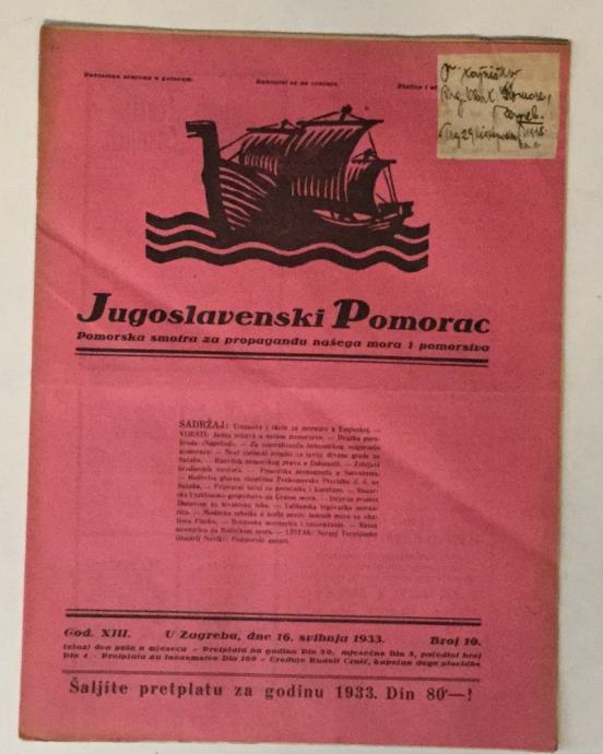 JUGOSLAVENSKI POMORAC, ČASOPIS BROJ 10, GODINA 1933.