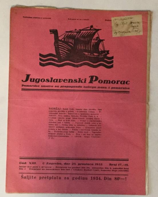JUGOSLAVENSKI POMORAC, ČASOPIS BROJ 17-18, GODINA 1933.