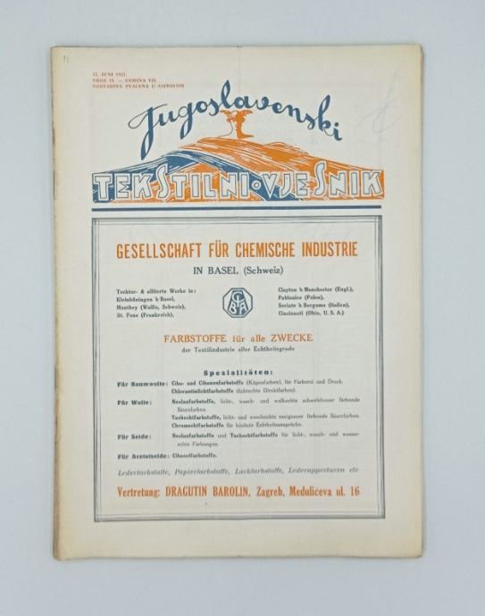 Jugoslavenski tekstilni vjesnik br. 11/1933Stručni list za cjelokupnu testilnu industriju i trgovinu u JugoslavijiStranica: 15Dimenzije: 24x34Jezik: ZagrebPismo: LatinicaStanje: Vrlo dobroUvez: MekiGodina: 1933