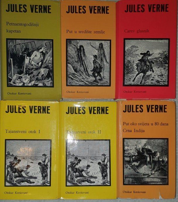 1. Tajanstveni otok I 2. Tajanstveni otok II 3. Put oko svijeta u 80 dana, Crna Indija 4. Carev glas 5. Put u središte zemlje 6. Petnaestogodišnji kapetanStranica: 299+431+401+495+402+399Dimenzije: 11.5x19.5 cmJezik: RIJEKAPismo: LatinicaStanje: OdličnoUvez: TvrdiGodina: 1969