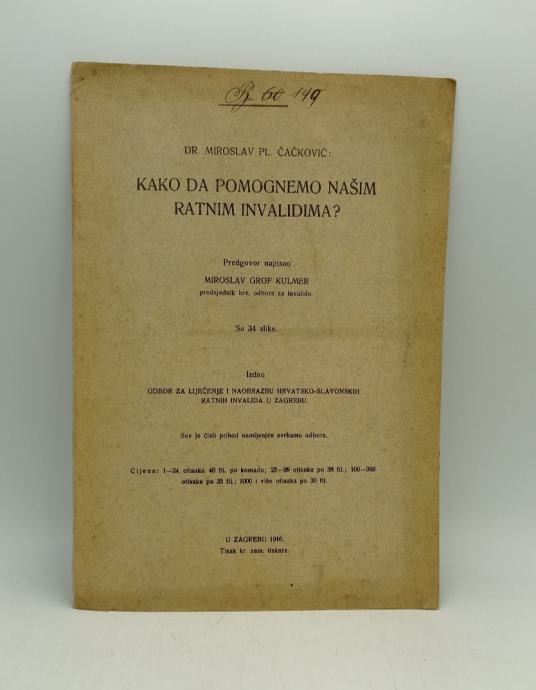 Miroslav Čačlović: Kako da pomognemo našim ratnim invalidima?Predgovor napisao Miroslav Grof Kulmer (predsjednik hrvatskog odbora za invalide)Sa 34 slike Stranica: 36Dimenzije: 17x24.5Jezik: ZagrebPismo: LatinicaStanje: DobroUvez: MekiGodina: 1916
