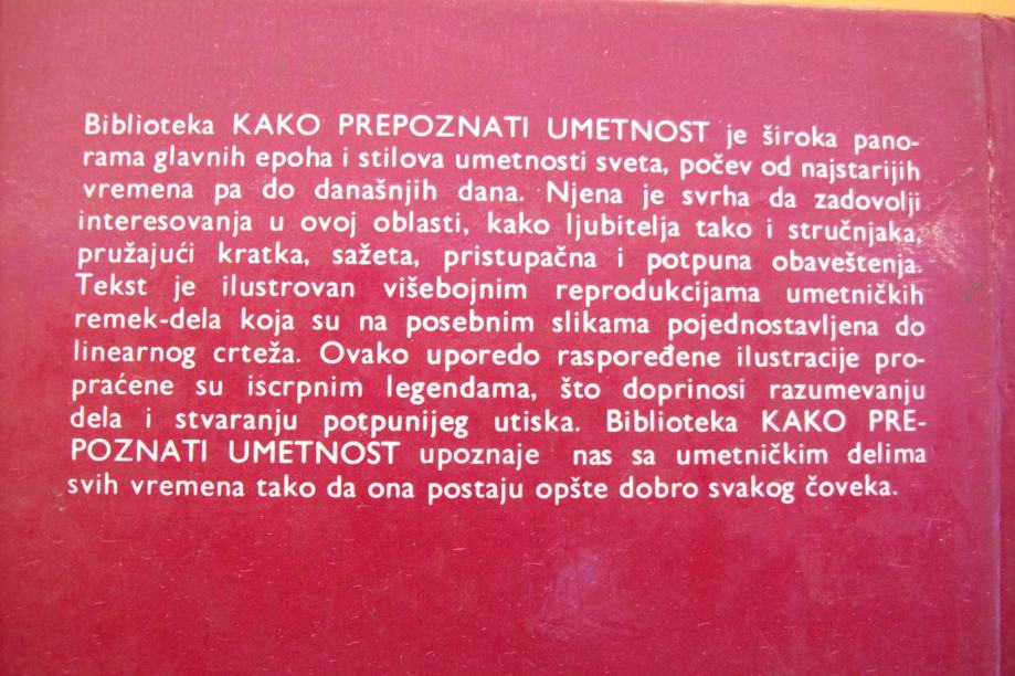 BIBLIOTEKA KAKO PREPOZNATI UMJETNOST- Vuk Karadžić je široka panorama glavnih epoha i stilova umetnosti sveta, od najstarijih dana do savremenog doba. Daje kratka,sažeta,pristupačna i potpuna obaveštenja koja mogu podjednako da zadovolje interesovanja i stručnjaka i ljubitelja umetnosti. Tekst je ilustrovan višebojnim reprodukcijama umetničkih remek dela, komplet sadrži sledeće knjige: