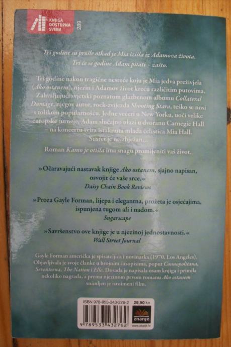 Tri godine su prošle otkad je Mia izišla iz Adamova života. Tri će se godine Adam pitati – zašto. Tri godine nakon tragične nesreće koju je Mia jedva preživjela (Ako ostanem), njezin i Adamov život kreću različitim putovima. Zahvaljujući svjetski poznatom glazbenom albumu Collateral Damage, njegov autor, rock-zvijezda Shooting Stara, teško se nosi s tolikom popularnošću. Jedne večeri u New Yorku, uoči velike europske turneje, Adam slučajno ulazi u dvoranu Carnegie Hall – na koncertu svira istaknuta mlada čelistica Mia Hall. Susret je neizbježan… Roman Kamo je otišla ima snagu promijeniti vaš život. »Očaravajući nastavak knjige Ako ostanem, sjajno napisan, osvojit će vaše srce.« - Daisy Chain Book Reviews
