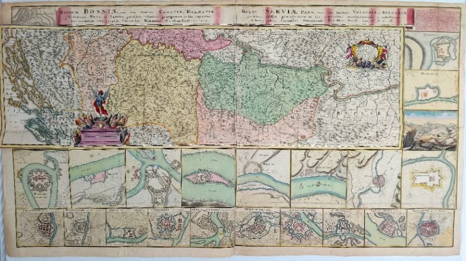 Johann Friedrich Ottinger: Regnum Bosniae, una cum finitimis Croatiae, Dalmatiae, Slavoniae, Hungariae et Serviae partibus, adjuncta praecipuorum in his regionibus munimentorum ichonographia. Regni Servia pars, una cum finitimis Valachiae, Bulgariae partibus, addita praecipuorum in his regionibus munimentorum et castellorum ichonographia. - Karta kraljevine Bosne, Srbije i susjednih zemaljaOva karta prikazuje novi položaj granice Bosne, Srbije i susjednih zemalja ustanovljene nakon mira u Požarevcu 1718. godine. Pokriva ratište između Austro-Ugarskog Carstva pod Karlom VI. i Osmanskog Carstva pod Ahmetom IV. Prikazani gradovi su Vidina, Nikopolja, Niša, Čačka, Sarajeva, Kragujevca, Valjeva, Užica, Broda, Bihaća, Zvornika, Rače, Šabca, Beograda i Oršave.Johann Friedrich Ottinger: njemački vojni inženjer i kartograf druge polovine 18 stoljeća. Godine 1760. izradio je kartu Servia za Homanove nasljednike. Za istu je kartografsku radionicu a ujedno i izdavačku kuću još 1730-ih godina objavio Regnum Bosniae una cum finitimis Croatiae, Dalmatiae, Slavoniae .. partibus. LIT: https://digitalna.nsk.hr/pb/?object=info&id=11284, pristup 13.7.2018. Bonacker, 1966, 172; Tooley, 1797, 479.Stranica: -Dimenzije: 116x64.2Jezik: NurnbergPismo: LatinicaStanje: Vrlo dobroGodina: 1732