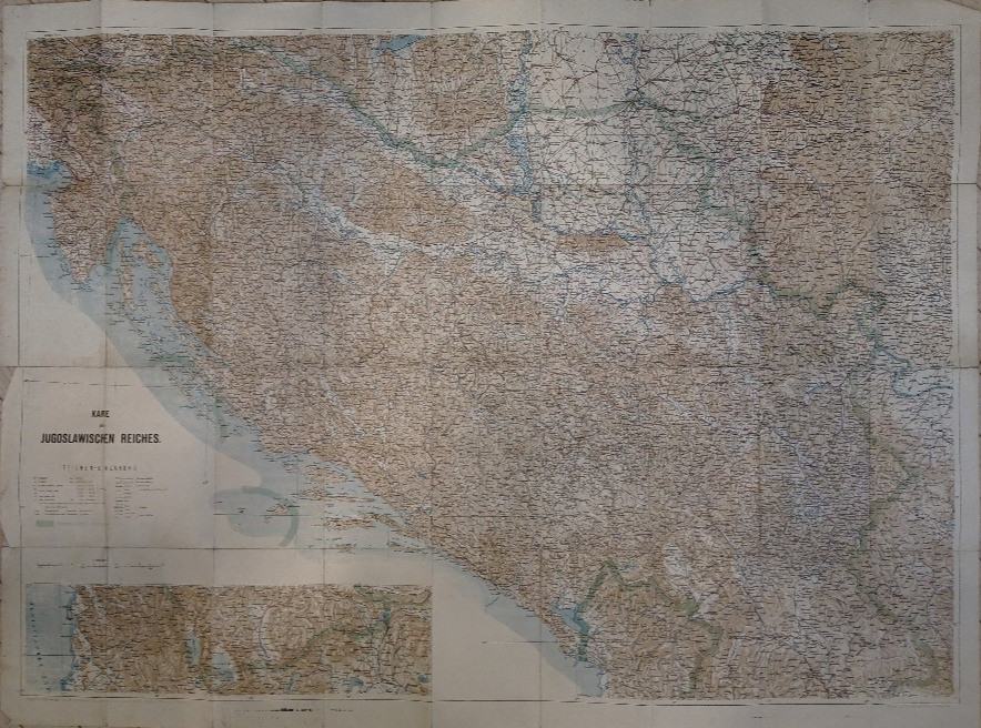 Ubersichtskarte des Jugoslawischen ReichesKarta Jugoslavije, iz 1930ih. mjerilo: 1:750.000Stranica: /Dimenzije: 108x78Jezik: Beč/WienPismo: LatinicaStanje: DobroUvez: MekiGodina: cca