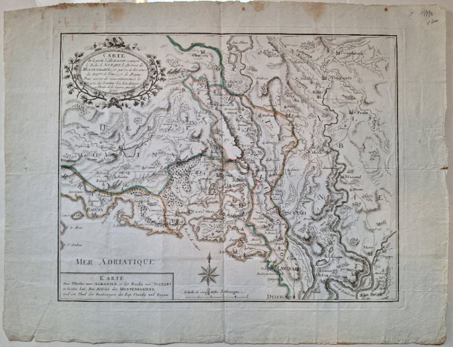 François Joseph Maire: Karte des Theiles von Albanien, so der Bascha von Scutari in Besitze hat, der District der Montenegriner und ein Theil der Besitzungen der Republik Venedig und RagusaFrançois Joseph Maire (1738. - oko 1800.) bio je francuski kartograf, hidrograf i vojni inženjer sa sjedištem u Beču, aktivan od sredine do kraja 18. stoljeća. Vjeruje se da je rođen u Lorraineu u Francuskoj, Maire je objavio brojne karte, a posebno je poznat po kartama izrađenim tijekom Rusko-turskog rata 1787. - 1792., koji se odvijao istovremeno s Austro-turskim ratom.Detaljna karta dijela Hrvatske, Crne Gore, Bosne i Hercegovine i Albanije s utvrđenim gradovima Dubrovnikom, Skadrom, Barom i mnogim drugima. - Francois Joseph Maire (1738. - oko 1800.) bio je izdavač, geograf i inženjer aktivan u Beču. Objavio je neke karte u vezi s rusko-austrijsko-turskim ratom 1787.-91. - S tragovima izvornih preklopa. Horizontalni preklop preventivno podložen papirom.Dimenzije: 55x42.5Jezik: BečPismo: LatinicaStanje: Vrlo dobroUvez: MekiGodina: 1788