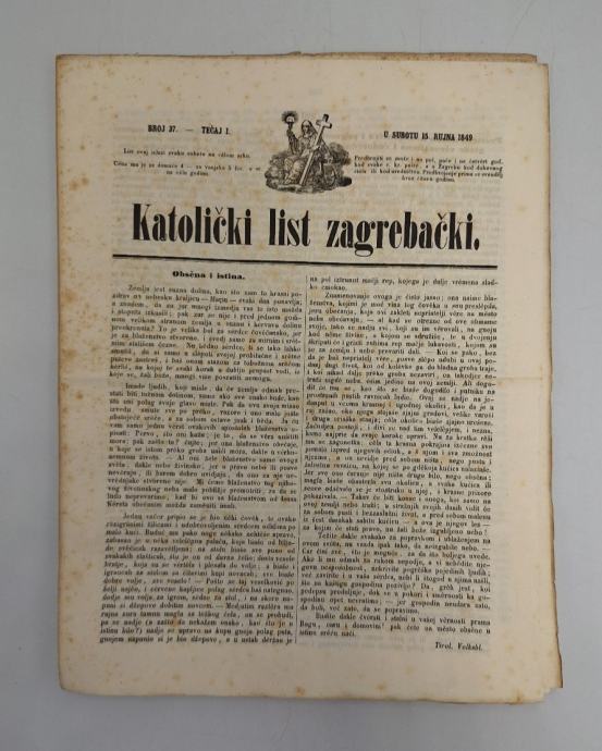 Katolički list zagrebački br. 37/1849.Urednik: Stepan MuzlerStranica: 6Dimenzije: 23x29Jezik: ZagrebPismo: LatinicaStanje: Vrlo dobroUvez: MekiGodina: 1849