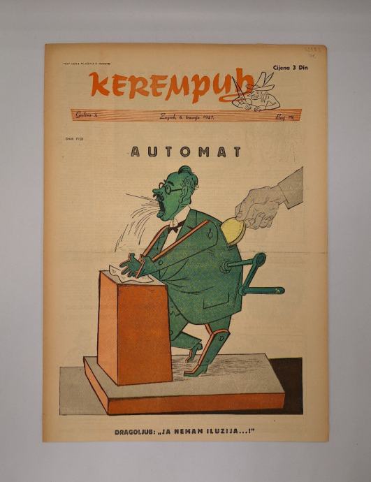 Kerempuh br. 78/1947.Glavni i odgovorni urednik: Fadil HadžićKerempuh, humoristično-satirični tjednik pokrenut u rujnu 1945. u Zagrebu. Od listopada 1955. do studenoga 1956. izlazio mjesečno kao Književni časopis za satiru i humor. Do 1958. izlazio ponovno kao samostalna tjedna novina, a nastavio kao prilog nedjeljnoga broja Vjesnika do kraja 1965. U prvom broju nije bilo navedeno ime glavnoga urednika; od 2. broja glavni urednik bio je Ivan Laća, od 7. broja Veljko Klašterka; poslije su to bili F. Hadžić (u više navrata), F. Barbieri, T. Đurinović, M. Matošec, O. A. Reisinger i dr. U listu su surađivali mnogobrojni književnici i umjetnici: G. Krklec, S. Kolar, V. Majer, J. Horvat, D. Gervais, B. Ćopić, A. Pal, I. Režek, A. Kinert, O. A. Reisinger, N. Dragić, I. Kušanić, B. Dovniković i dr.Stranica: 8Dimenzije: 31.5x44.5Jezik: ZagrebPismo: LatinicaStanje: Vrlo dobroUvez: MekiGodina: 1947