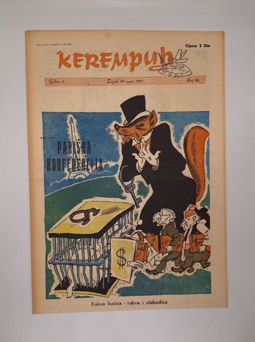 Kerempuh br. 93/1947.Glavni i odgovorni urednik: Fadil HadžićKerempuh, humoristično-satirični tjednik pokrenut u rujnu 1945. u Zagrebu. Od listopada 1955. do studenoga 1956. izlazio mjesečno kao Književni časopis za satiru i humor. Do 1958. izlazio ponovno kao samostalna tjedna novina, a nastavio kao prilog nedjeljnoga broja Vjesnika do kraja 1965. U prvom broju nije bilo navedeno ime glavnoga urednika; od 2. broja glavni urednik bio je Ivan Laća, od 7. broja Veljko Klašterka; poslije su to bili F. Hadžić (u više navrata), F. Barbieri, T. Đurinović, M. Matošec, O. A. Reisinger i dr. U listu su surađivali mnogobrojni književnici i umjetnici: G. Krklec, S. Kolar, V. Majer, J. Horvat, D. Gervais, B. Ćopić, A. Pal, I. Režek, A. Kinert, O. A. Reisinger, N. Dragić, I. Kušanić, B. Dovniković i dr.Stranica: 8Dimenzije: 31.5x44.5Jezik: ZagrebPismo: LatinicaStanje: Vrlo dobroUvez: MekiGodina: 1947