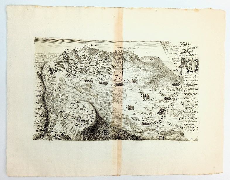 Vincenzo Coronelli: Knin (Knin assediato, e reso sotto il dominio Veneto li ii settemb. 1688 doppo 14 giorni d'attacco per l'Armi della Serenissma Republica commandate dall'Eccellenza del Sig. Cau. Procuratore Girolamo Corner.)Vincenzo Maria Coronelli (1650.-1718.), teolog, kozmograf, geograf, kartograf i izdavač. Od 1667. – 1671. Učio je astronomiju kod Pietra Martire Rusca. Godine 1671. Pristupio je franjevačkom redu i živio u mletačkom samostanu S. Marie Gloriose dei Frari u Veneciji. Studirao je teologiju i humanistiku u rimskom kolegiju S. Bonaventura, gdje je učio i Euklidovu geometriju. Doktorirao je u Rimu 1973. Za vrijeme boravka u Padovi, od 1674. do 1677., zajedno s grofom Francescom Damianijem istraživao je Euklidovu geometriju. Bavio se geografijom, povješću, kartografijom, bakrorezom, izadom globusa i graditeljstvom. Na zahtjev vojvode Rannucia Farnesea 1678. izradio je prvi globus. Uveneciji je uživao velik ugled i imapžo pristup u tajne arhive Mletačke Republike da bi došao do podataka za izradu karata. Pretpostavlja se da je sam Coronelli ctao svoje karte na bakrenoj ploči. Godine 1685. (ili 1686) objavio je dva djela o Moreji Conquiste della Republica in Dalmazia Epiro e Morea i Memorie istoriografiche del Regno di Morea e di Negroponte. Dubrovčani su ga prije nego je tiskao djelo 1685. odlučili nagraditi s dvadeset cekina, ako objavi tekst o Dubrovačkoj Republici. Coronelli je unio poslane podatke, pa je to prva sačuvana geografska karta na kojoj je područje Dubrovačke Republike dosta točno i pouzdano prikazano. Karta je objavljena u tom izdanju, ali i u drugim njegovim djelima s naslovom Stato di Ragusi, Bocca del Fiume Narentam, Isole di Lesina e Curzola ella Dalmatia posseduta Dalla Serenissima Republica di Venetia. Na njoj se vidi obalni pojas primorja od Makarske do Boke kotorske, a na moru svi veći jadranski otoci. Coronelli je priložio i grafički prikaz trase karavanskog puta od Dubrovnika do Carigrada Viaggio da Ragusi a Constantinopoli per la Bosa, Servia, e Romania. U tom izolaru nalazi se karta šire okolice Zadra Contando di Zara, Parte della Dalmatia. S obzirom na veličinu i mjerilo to je vrlo detaljna karta, pa se može smatrati prvom topografskom kartom tog područja. Njegovo najveće kartografsko djelo ja Atlante Veneto, atlas čiji je prvi svezak objavljen 1691, a drugi 1695. U Veneciji j že 1680. osnovao prvo geografsko društvo, Accademia Cosmographica degli Agronauti, jedno od najstarijih geografski društava na svijetu. Namjer mu je bila da razvije i izdavačku djelatnost kako bi organiziralo distribuciju njegovih radova širom EuropeStranica: -Dimenzije: 56x44Jezik: VenecijaPismo: LatinicaStanje: Vrlo dobroGodina: 1689