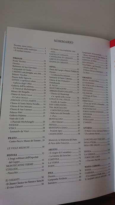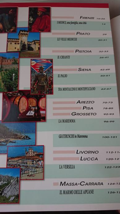 Sadržaj je vidljiv na slikama, knjiga je puna predivnih slika u boji i to kompletno cijele Toskane, savršena za sve zaljubljenike u tu predivnu regiju ili one koji ju tek namjeravaju posjetiti. Knjiga je na talijanskom jeziku.