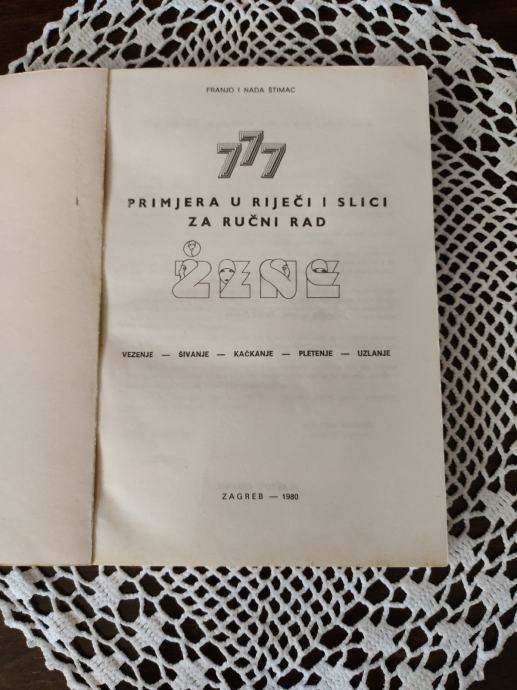 Knjiga sa 777 primjera u riječi i slici za ručni rad, vezenje,šivanje, kačkanje, pletenje,uzlanje. Knjiga je očuvana sa slikama i savjetima za razne radove.Šaljem tiskom.