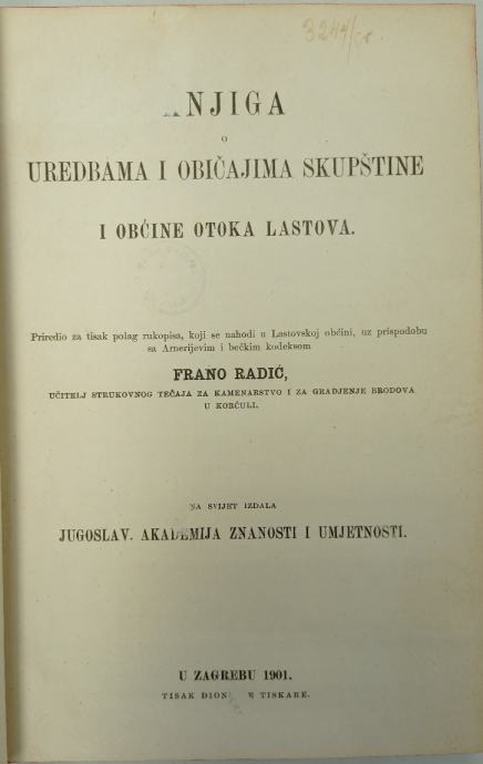 Frano Radić: Knjiga o uredbama i običajima skupštine i obćine otoka LastovaMonumenta historico-juridica Slavorum meridionaliumBaltazar Bogošić: Liber statutorum civitatis Ragusii compositus anno 1272.Monumenta historico-juridica Slavorum meridionaliumU knjizi su zajedno uvezena dva naslova.Stranica: 138 + 466Dimenzije: 17x23Jezik: ZagrebPismo: LatinicaStanje: Vrlo dobroUvez: TvrdiGodina: 1901
