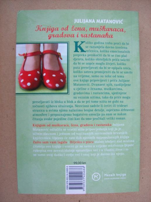 "Knjigom od muškaraca, žena, gradova i rastanaka" Julijana Matanović odlučila se vratiti stilu pripovijedanja koji ju je učinio jednom od najčitanijih suvremenih hrvatskih spisateljica. Upravo će zato duh njezinih najpopularnijih knjiga "Zašto sam vam lagala" i "Bilješka o piscu" stalno lebdjeti nad mislima čitatelja ove knjige i vratiti ga ne samo u vrijeme otkrivanja ljepote rukopisa ove nesvakidašnje spisateljice već i u vlastiti život i to ne samo ovaj danas i ovdje već i onaj koji je davno iza njega..