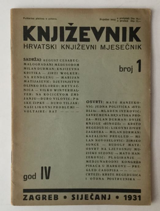 KNJIŽEVNIK : HRVATSKI KNJIŽEVNI MJESEČNIK BROJ 1