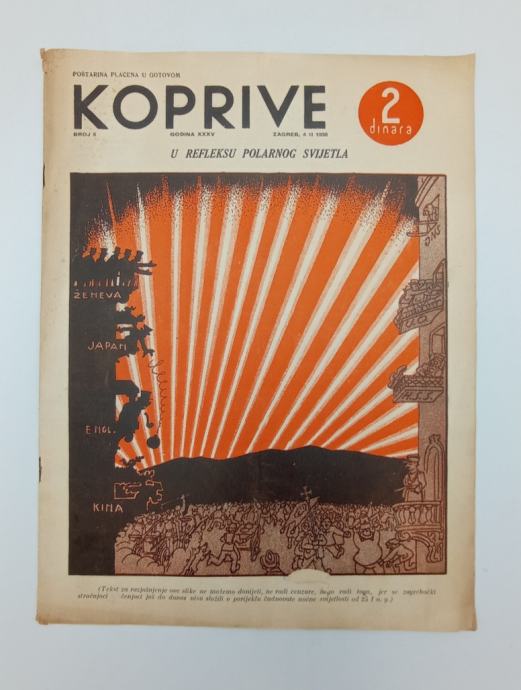 Koprive br. 6/1938List za satiru i humorStranica: 7Dimenzije: 28x31Jezik: ZagrebPismo: LatinicaStanje: DobroUvez: MekiGodina: 1938