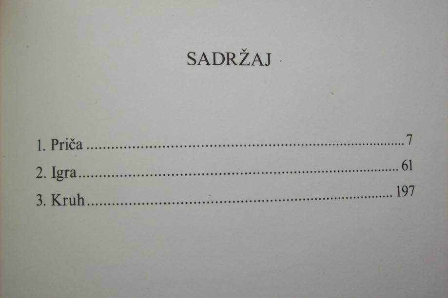 Autor u svojoj četrnaestoj knjizi tematizira propale sportaše, iznoseći pred čitatelja čitav dijapazon problema kojim se oni susreću: njihove izgubljene snove, traume, psihološka posrtanja. U slijedećoj priči autor upoznaje čitatelja s osnovama stvaranja dokumentarnog filma, dok ga u trećoj priči upoznaje s detaljima prozvodnje kruha. Poučno i didaktički - tako svojstveno autoru, predstvaljene su sve tri priče i likovi koji ih grade.