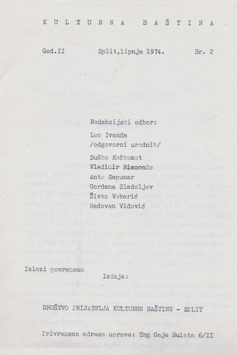 Kulturna Baština Split broj 2 Tisak: šapilograf, izuzetno rijetko