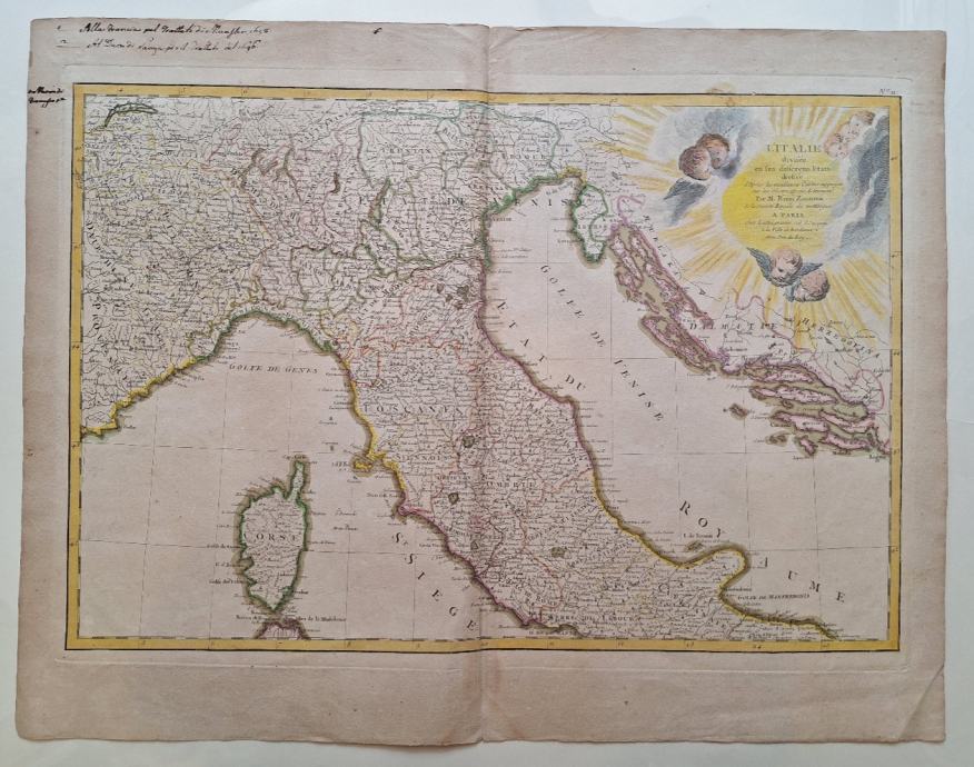 Giovanni Antonio Bartolomeo Rizzi Zannoni: L'Italie divisee en ses differens Etats dress d'apres les meilleurs Cartes appuyee sur les Observations Astromom'Prekrasan primjer Rizzi-Zannonijeve dvostrane dekorativne karte Italije iz 1770. godine. Gornji list pokriva područje od Ženevskog jezera i Mletačkih država prema jugu, uključujući Rim, Korziku i Capitanu. Također uključuje Mletački zaljev i države Dalmaciju, Hercegovinu i Murlaku. Velika dekorativna kartuša sa sunčevim zrakama i brojnim puttima (malim kerubinima) nalazi se u gornjem desnom kvadrantu.Stranica: 1Dimenzije: 50.5x39Jezik: ParizPismo: LatinicaStanje: Vrlo dobroUvez: MekiGodina: 1770