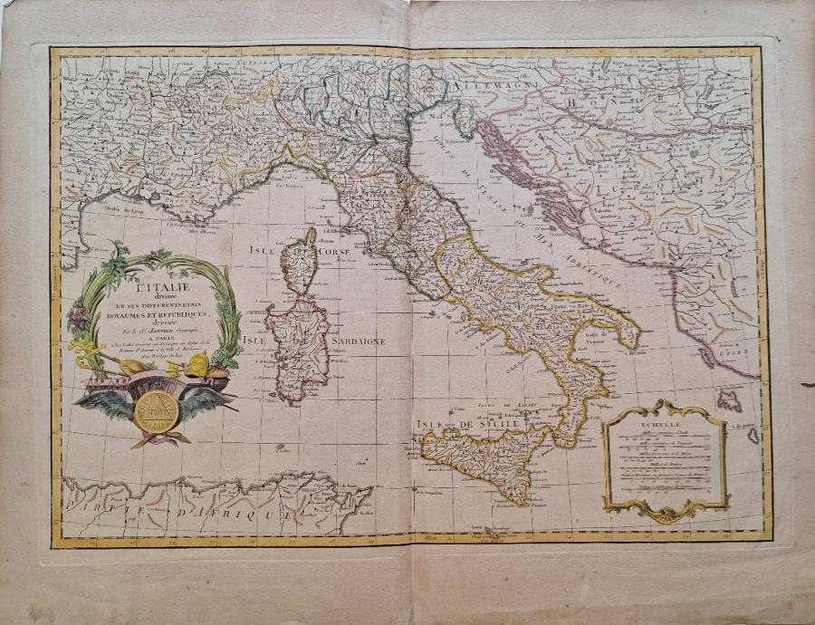 L'Italie divisee en ses differents etats, royaumes et republiques, dressee par le Sr. Janvier Geographe. A Paris, Chez Lattre Graveur, rue St. Jacques, au dessus de la Fontaine St. Severin, a la Ville de Bordeaux. Avec privilege du Roy. Stranica: 1Dimenzije: 50x39Jezik: ParizPismo: LatinicaStanje: Vrlo dobroUvez: MekiGodina: 1780