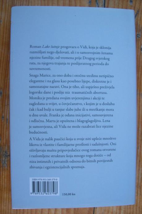 Roman Lake šutnje progovara o Vidi, koja je sklonija razmišljati nego djelovati, ali i o samosvojnim ženama njezine familije, od vremena prije Drugog svjetskog rata, za njegova trajanja te poslijeratnog perioda do suvremenosti. Snaga Marice, za ono doba i otočnu sredinu netipično elegantne i na glasu kao posebno lijepe, diskretne je i samozatajne naravi. Ona je tiho, ali uspješno preživjela logorske dane i poslije niz traumatičnih abortusa. Monika je predana svojim uvjerenjima i akciji te zagledana u svijet, u čovječanstvo, s kojim je u dosluhu čak i kad bulji u tanjur slabe juhe ili u mreškanje mora u dnu uvale. Franka je odana inicijativi, samouvjerena i odlučna. Marta je opuštena i blagoglagoljiva. Lena je samosvjesna, ali Vida ne može razabrati lice njezine budućnosti. A Vida je nalik paučici koja u svoje niti upleće mnoštvo likova iz vlastite i familijarne prošlosti i sadašnjosti. Oni oživljavaju maštu pripovjedačice ovog romana otvorene i razlomljene strukture koja mnogo toga dotiče – od niza intimnih i privatnih odnosa do bitnih povijesnih zbivanja i egzistencijalnih spoznaja.