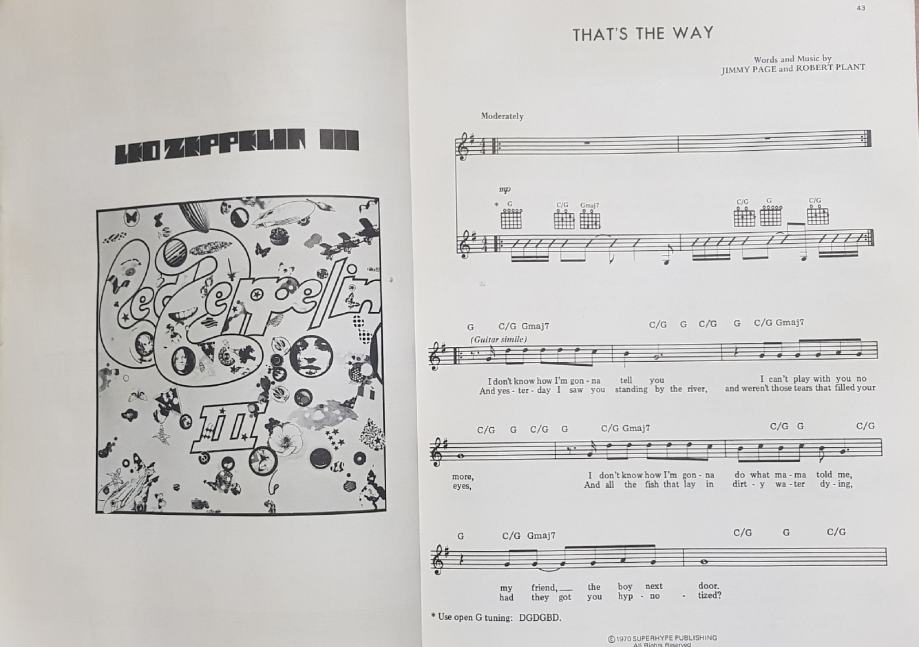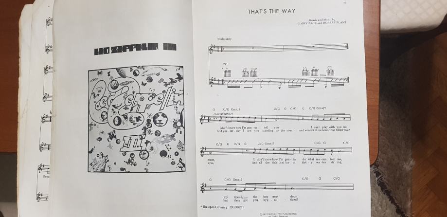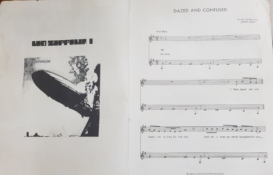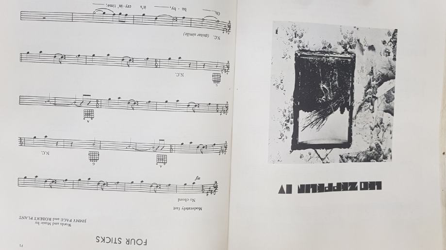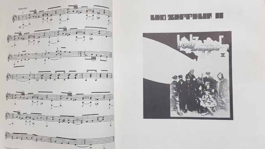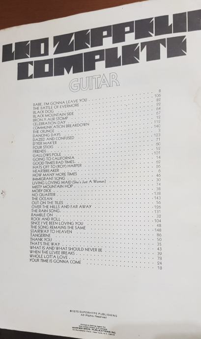 Tekstovi pjesama i Notni zapis za solo gitaru, za 6 albuma legendarne grupe Led Zeppelin na 152 stranice, velikog formata.Izdanje Superhype Publishing 1969 & 1975. Words and Music by Jimmy Page, Robert Plant, John Bonham, John Paul Jones, Memphis Minni......