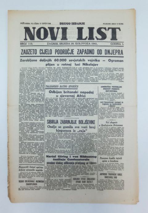 Novi list br. 113/1941 - drugo izdanjeDnevne novine koje su izlazile u jutarnjem i večernjem izdanjuUrednik: Franjo DujmovićStranica: 19Dimenzije: 32x47Jezik: ZagrebPismo: LatinicaStanje: DobroUvez: MekiGodina: 1941