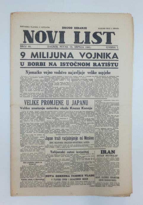 Novi list br. 80/1941Dnevne novine iz vremena NDHUrednik: Franjo DujmovićStranica: 19Dimenzije: 32x48Jezik: ZagrebPismo: LatinicaStanje: DobroUvez: MekiGodina: 1941