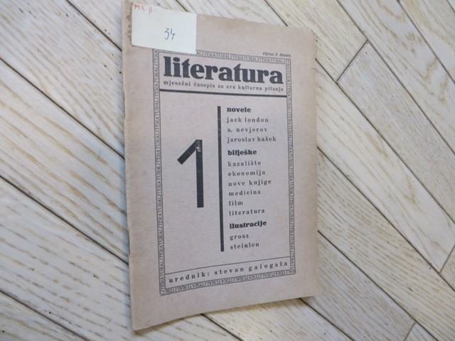 Literatura br.1., god.1.Novele, bilješke, ilustracijeUrednik: Stevan Galogaža Sadržaj: Jack London, Nevjerov, Hašek, kazalište, ekonomija, medicina, nove knjige, film, literatura... Likovni prilozi Georg Grosz i Théophile Steinlen. Stranica: 32Dimenzije: 14x21Jezik: ZagrebPismo: LatinicaStanje: Vrlo dobroUvez: MekiGodina: 1931