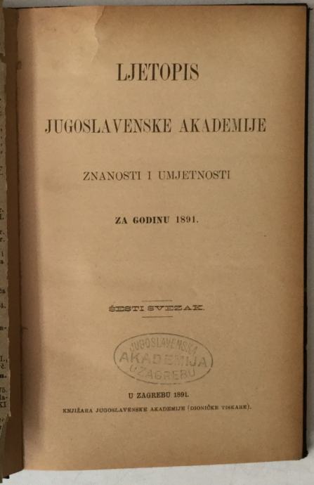 LJETOPIS JUGOSLAVENSKE AKADEMIJE ZNANOSTI I UMJETNOSTI ZA GODINU 1891.