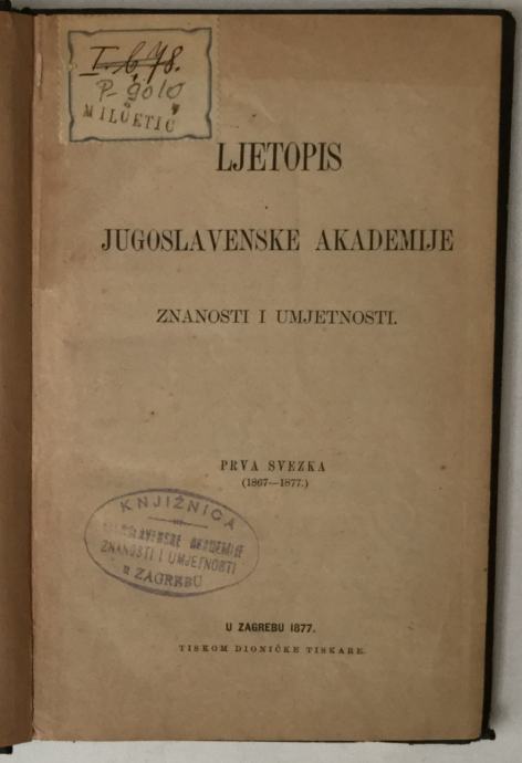 LJETOPIS JUGOSLAVENSKE AKADEMIJE ZNANOSTI I UMJETNOSTI, PRVA SVEZKA (1