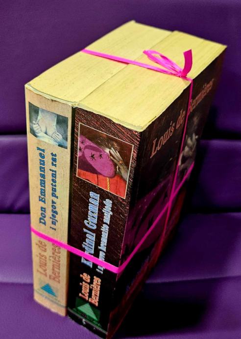 DON EMMANUEL I NJEGOV PUTENI RATU jednoj siromašnoj i ne baš potpuno izmišljenoj zemlji Južne Amerike život teče svojim uobičajenim tokom; siromašni seljaci muku muče s nezainteresirano korumpiranom oligarhijom, bezrazložno brutalnim vojnicima i zbunjenim kontradiktornim gerilcima. Kada jedna vojna ekspedicija protiv gerilaca završi pokušajem silovanja lijepe mještanke, pokrenut će se lanac neželjenih posljedica. U selu gdje je engleski imigrant Don Emmanuel, veleposjednik i duhovni guru lokalnim kurvama, vojska će naići na neočekivano tajno puteno oružje: Slatkicu. U dubokoj prašumi Indijanac Aurelio saznat će bolnu istinu o nagaznim minama, a vojnici će naučiti nešto o vještinama domorodačkog lova. Gerilci će nakon preobrazbe otete Done Constanze početi gledati klasnog neprijatelja drugačijim, mnogo pohotnijim očima. I dok cijela zemlja neumitno klizi prema bankrotu, vojnici će posljednji put pokušati svladati brojčano jačeg i intelektualno superiornijeg protivnika: Don Emmanuela i njegove sumještane. Ako vam ni nakon pedeset stranica ne bude jasno kojem točno žanru pripada ovaj roman, nemojte se brinuti, u sigurnim ste rukama. Prvi roman Louisa de Bernièresa ima sve sastojke klasika latinskoameričke književnosti, ali ovaj put iz pera engleskog autora rođenog u Londonu 1954. Potpuno nekonvencionalna mješavina političke burleske i svakodnevnog nadrealizma u ovoj bjesomučnoj liričnoj tragikomediji zbunit će vas svojim neodoljivim šarmom koji je postao zaštitni znak autora svjetski poznate "Mandoline kapetana Corellija". “Don Emanuel i njegov puteni rat" prva je od triju knjiga iz Bernièresova latinskoameričkog ciklusa.KARDINAL GUZMAN I NJEGOVO BREMENITO NASLJEĐEU završnoj knjizi kronika o čudesnom gradu u Andama, Cochadebaju i njegovim još neobičnijim stanovnicima Louis de Bernieres vratit će se svim onim sada već dobro znanim likovima iz prethodnih knjiga. Don Emmanuel, Dionisio Vivo i ostali morat će se još jednom suočiti s kušnjom u obliku bremenitog nasljeđa lika i djela kardinala Guzmana. Progonjen osobnim demonima Guzman će možda pomalo naivno i nehotice pokrenuti lavinu događaja koja će kulminirati križarskim pohodom Nove Inkvizicije. Zemlju koju je već poharala vojska i kokainska mafija, sada će dohvatiti pošast vjerskog fanatizma. Pod krinkom vjere počet će novi niz besmislenih brutalnosti; spirala nasilja opisat će novi krug pakla. No usred tog kaosa i dalje se događaju čudesno lijepe stvari. Nove ljubavi će propupati, stare rane zacijeliti, a neke će duše ponovno biti rođene. Stanovnici Cochadebaja svoju će slobodu morati obraniti onako kako to ljudi rade vjekovima – s oružjem u ruci i srcem u grudima. Stranica: 440+511Dimenzije: 13 × 20 cmJezik: ZagrebPismo: LatinicaStanje: OdličnoUvez: MekiGodina: 2003
