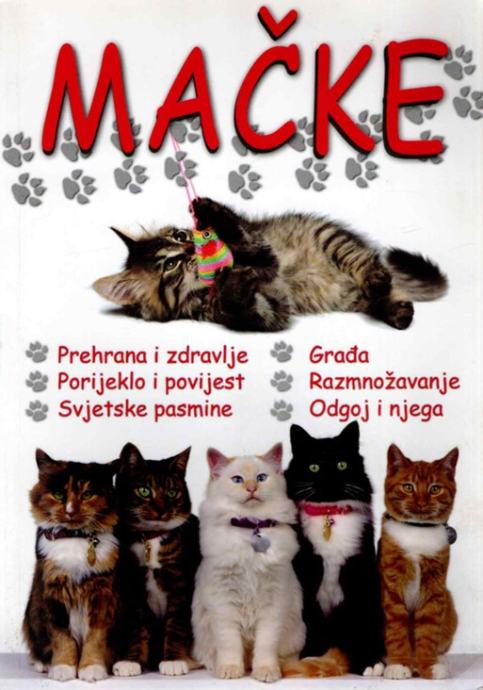 Ova knjiga na popularan, ali ujedno i cjelovit i stručan način, objašnjava sve o mačkama: njihovom porijeklu, tjelesnoj građi i različitostima među pasminama. Detaljan opis i ilustracije u boji pomoći će vam razlikovati različite vrste mačaka i njihove mnogobrojne podvrste kao što su perzijska mačka, cymric, birmanska mačku, abesinka, angora, manx, sfinks, sijamska mačku, tiffanie,…Doznat ćete i sve o potrebnoj njezi, dinamici razmnožavanja i mačjem biološkom ciklusu. Također, u ovom priručniku naći ćete vrijedne savjete o tome kakvu opremu za mačke kupiti, koju hranu izabrati, kako postupiti u slučaju bolesti, kako mačku lako okupati. Ovaj priručnik će vam olakšati izbor kućnog ljubimca i pomoći vam da ga učinite sretnim i zadovoljnim.Stranica: 96Dimenzije: 24x17Jezik: SPLITPismo: LatinicaStanje: OdličnoUvez: Meki