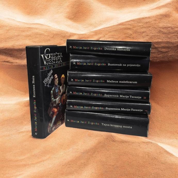 Grička vještica nije jedan jedinstveni roman, nego ciklus romana od sedam svezaka. Prvi roman čuvenog ciklusa pod nazivom Tajna krvavog mosta počinje izlaziti 1912. godine u Malim novinama, a tiska se u svescima. Uspjeh je tako živ da vlasnici tiskare, ne pitajući Mariju Jurić Zagorku, objavljuju na kraju romana da je to tek uvod i da će se uskoro pojaviti nastavak. Zapregnuta u taj pripovjedačko-novinarski jaram, autorica piše iz dana u dan, te objavljuje uoči I. svjetskog rata (1913.-1914.) Kontesu Neru, i Malleus maleficarum. Poslije rata u “Novostima” i “Večeri” ostale romane koji se ideološki i tematski nadovezuju na one spomenute: Dvorska kamarilla, Suparnica Marije Terezije i Buntovnik na prijestolju. Po temi to je ljubavni roman s elementima pustolovnog, kriminalističkog, akcijskog, povijesnog. Djelo je nastalo u razdoblju moderne, no ono nije reprezentativan primjer toga razdoblja. U djelu se susrećemo sa mnogim romantičarskim motivima kao što su npr. : mistika, tajanstvenost, neobjašnjiva ubojstva, lik kontese Nere koji je tipičan romantičarski lik (ona je zbog svojih stavova u sukobu s društvom u kojem živi), spisateljičino unošenje narodne usmene predaje u radnju. Također se ističe utjecaj hrvatskog narodnog preporoda na Zagorkino stvaralaštvo. On se očituje u pomalo antiaustrijskoj orijentaciji jer Zagorka, pišući o borbi glavnih junaka za svoju sreću na bečkom dvoru, želi upozoriti na provođenje mađarizacije u njeno doba. Ona sugestivno , ali ipak neizravno ističe da glavne junake u tuđini sustižu nedaće jedna za drugom, te nam govori o spisateljičinom mišljenju kako Hrvatsku sustižu nevolje pod tuđom vlašću. Likovi se upuštaju u vratolomne pustolovine kako bi spasili svoje ideale, obranili svoje stavove ili razotkrili zločince. Razna ubojstva kao npr. u Tajni Krvavog mosta, kojim ubojica nagoviješta ubojstva još osmorice plemića daju kriminalističku notu romanu. Povijesni događaji koji su ukomponirani u djelo kao dio prepreka koje glavni junaci moraju prebroditi da bi ostvarili svoju sreću u romanu vrše ulogu Zagorkine namjere da hrvatske čitaoce zainteresira za hrvatsku povijest. Razni podzemni hodnici, tajni prolazi u zidovima palača, dvoraca (npr.: u Trakošćanu, Mokricama), zatvaranja u podrume, daju romanu ugođaj tajanstvenosti i mističnosti. Akcija se prikazuje uglavnom pomoću prepričavanja, jedna od rijetko opisanih je Sinišino prerušavanje u vraga. U romanu se pomoću dijaloga „…postiže maksimalna podudarnost vremena pripovijedanja i vremena opisanog zbivanja, na taj se način gotovo sva prikazivanja i prikazuju, što može zvučati čudno, jer se radi o vrsti romana u kojoj je akcija dominatni element sadržaja…” Likovi su plošno atribuirani i polarizirani. Imaju unaprijed zadane karakterne osobine: ili su dobri ili zli. Spisateljica ovom tehnikom, koja se još naziva i crno – bijela tehnika, radnju u biti svodi na stalnu borbu antagonističkih parova, bez psiholoških nijansi. Crno – bijela tehnika proteže se i na formiranje zapleta. Crni likovi su pokretači radnje, oni su organizatori spletki, a razlozi za ovakvu djelatnost raznoliko su motivirani, bilo glupošću, neukošću, gramzivošću ili sujetom, ali uvijek neobrazloženom osobinom lika. Bijeli se likovi nalaze u stalnom aktivnom stanju izmicanja pogibeljima koje im sa svih strana prijeteStranica: 494+374+420+307+339+397+444Dimenzije: 15×22,5 cmJezik: ZagrebPismo: LatinicaStanje: OdličnoUvez: TvrdiGodina: 1985