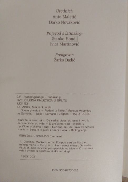 MARKO ANTUN DE DOMINIS : Radovi iz Fizike ( Opera Physica)