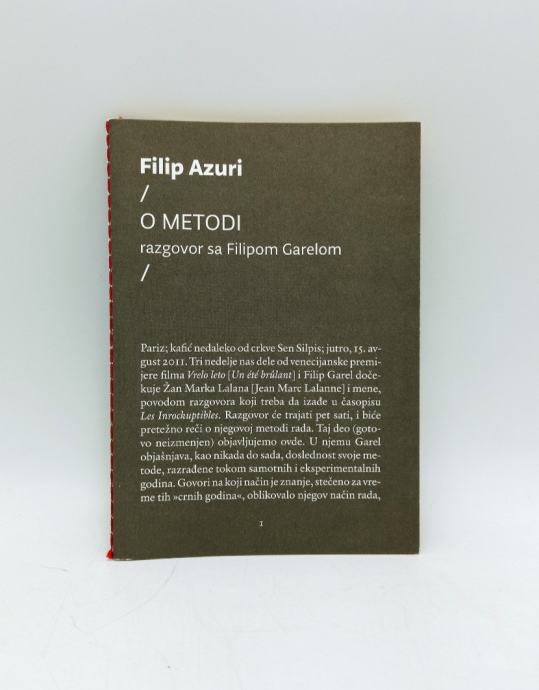 Philippe Azoury: O metodirazgovor sa Filipom Garelom»Postoji u tom trenutku, kada glumci po prvi put igraju scenu, a kamera snima, neka vrsta zabrinutosti koja je povezana sa strahom od postojanja.«Stranica: 20Dimenzije: 10x15Jezik: BeogradPismo: LatinicaStanje: Nova knjigaUvez: MekiGodina: 2017
