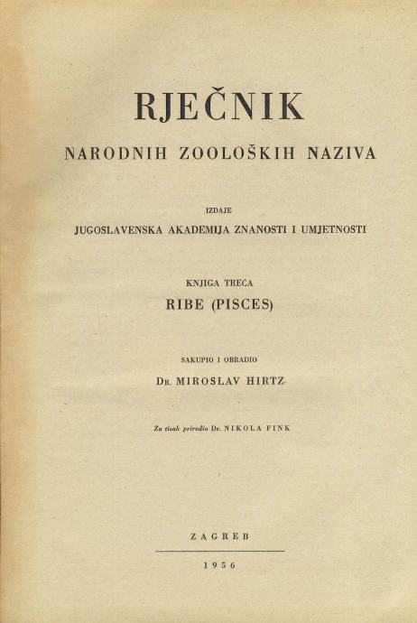 Miroslav Hirtz Rječnik narodnih zooloških naziva knjiga 3 Ribe Pisces