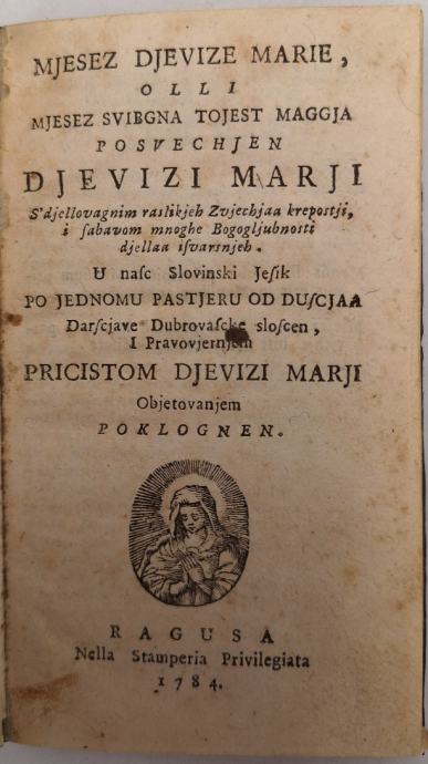 Mjesez Djevize Marie olli mjesez svibgna to jest maggja posvechen Djevizi Marji : s djellovagnim raslikijeh zvjechjaa kreposttji i sabavom mnoghe bogogljubnosti djellaa isvarsnjeh Stranica: 84Dimenzije: 9x15Jezik: DubrovnikPismo: LatinicaStanje: Vrlo dobroUvez: TvrdiGodina: 1784