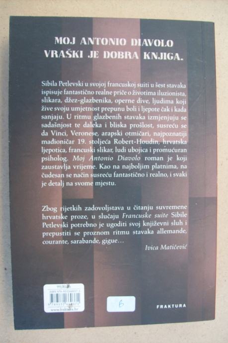 Sibila Petlevski u svojoj francuskoj suiti u šest stavaka ispisuje fantastično realne priče o životima iluzionista, slikara, džez-glazbenika, operne dive, ljudima koji žive svoju umjetnost prepunu boli i ljepote čak i kada sanjaju. U ritmu glazbenih stavaka izmjenjuju se sadašnjost te daleka i bliska prošlost, susreću se da Vinci, Veronese, arapski otmičari, najpoznatiji mađioničar 19. stoljeća Robert-Houdin, hrvatska ljepotica, francuski slikar, ludi ubojica i promućuran psiholog. Moj Antonio Diavolo roman je koji zaustavlja vrijeme. Kao na najboljim platnima, na čudesan se način susreću fantastično i realno, i svaki je detalj na svome mjestu.