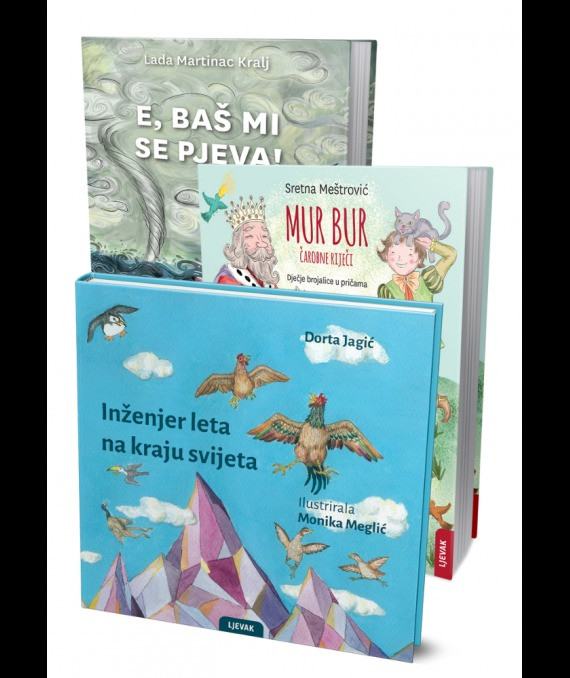 E, baš mi se pjeva! - Kad krenete na putovanje ovom knjigom, stići ćete do otočića koji leži daleko, na pučini. Obrubljen plavetnilom mora i neba dom je jednom gušteru, galebu i njihovu prijatelju dupinu. Neobična trojka toplih srca spasit će, u mjesečinom obasjanoj noći, četvrtu životinju: u more bačenog, nemilosrdno odbačenog mačića. Trud koji će životinje uložiti da mu spase život, a zatim da izgrade harmonične obiteljske odnose, bit će ugrožen onog dana kad na otočić, s neba, pijavicom donesen, padne Čovjek. Jer Čovjek, da bi spasio sebe, spreman je na sve.Inženjer leta na kraju svijeta - Što su to stare ptice Mudrovače, čavke zlogodnjače, jedne noći punog Mjeseca u gradskome parku ispričale okupljenim pticama? O kakvoj to tajanstvenoj Spravi šire glas? Govore o Stroju za let koji će i pticama neletačicama pomoći da osvoje visine. Ali što je ta Sprava i gdje se nalazi i tko je taj Princ koji je čuva? I postoji li čaroban ključ koji otključava ovu tajnu?Mur Bur - Pučke dječje pjesme, poznate u svijetu kao nursery rhymes, mi najčešće nazivamo malešnicama jer su namijenjene maloj djeci – djeci najmlađe dobi. Riječ je o vrlo starim pjesmama koje traju i obnavljaju se desetljećima i stoljećima, zapravo prvim pjesmama s kojima se dijete susreće u svojem odrastanju. Nastaju u druženju odraslih s djecom koji se inspiriraju djetetovim ponašanjem želeći ga zabaviti. Najčešće se stvaraju u igri, povezujući riječi i pokrete, pokreću djetetova osjetila i uvlače ga u aktivno sudjelovanje u toj zabavi.Jezik: ZagrebPismo: LatinicaStanje: Nova knjigaUvez: TvrdiGodina: 2020